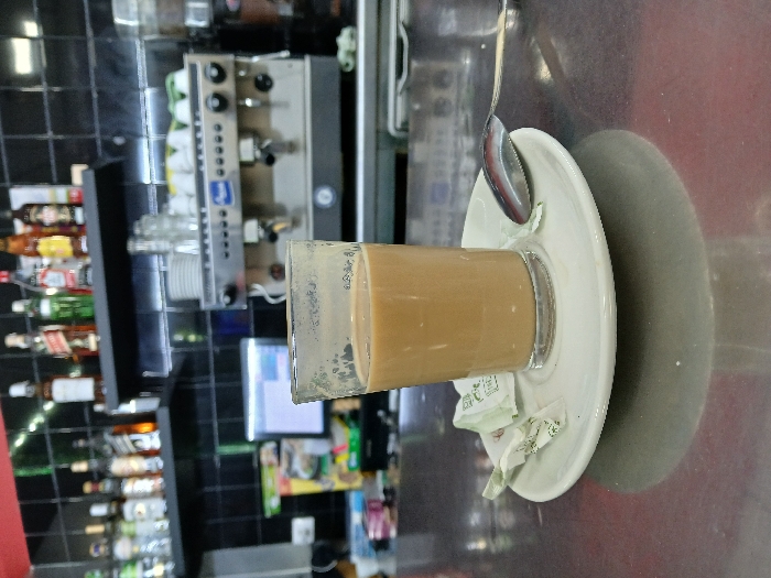 A glass of coffee sits on a white saucer with sugar packets and a spoon. The glass is nearly full, with a light brown liquid. The saucer casts a large shadow on a red-toned surface. In the background, shelves display liquor bottles and a stainless steel espresso machine stands against a black tiled wall. A computer monitor is visible further back.