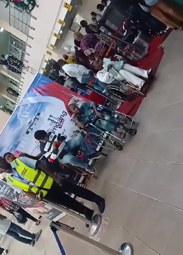 group of elderly people sitting in wheelchairs in what appears to be an airport or similar public space. They are waiting in a row, lined up next to a large advertisement banner. A security guard in a neon yellow vest stands near the front of the line. Other people can be seen standing around or sitting further back. The floor is tiled and the overall environment appears to be indoors and well-lit. Some of the people in wheelchairs appear to be resting or asleep.