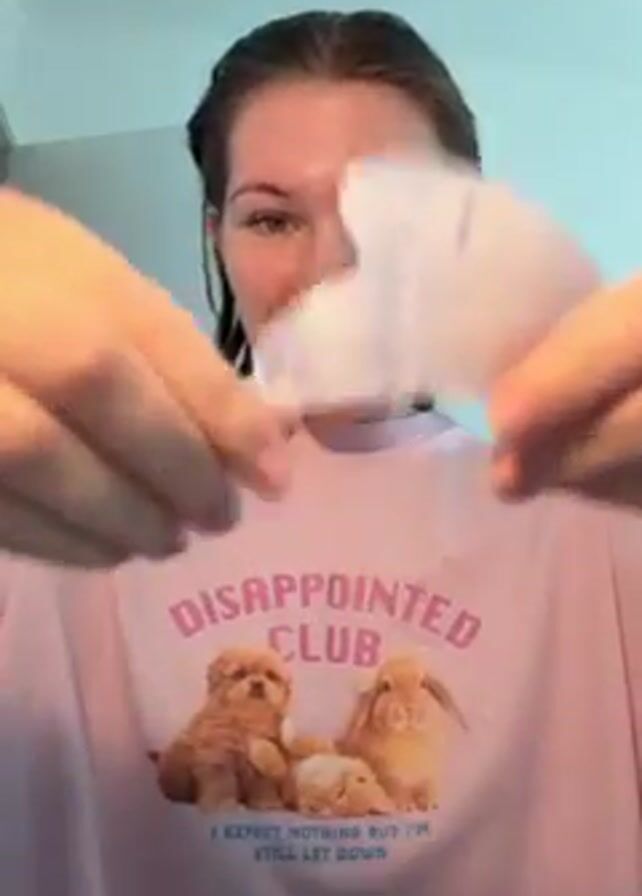 A fair-skinned person with wet brown hair, wearing a pink t-shirt with "DISAPPOINTED CLUB" printed on it, is in a bathroom holding up a light pink Gua Sha tool