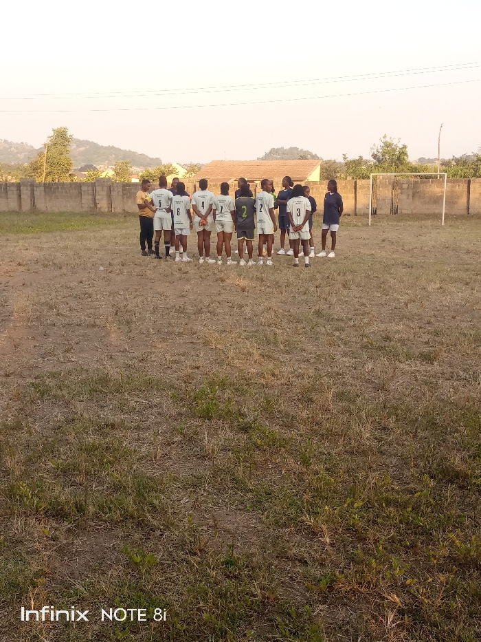 A group of people, likely a sports team with their coach, is gathered on a grassy field. They are facing away from the camera. Several are wearing uniforms with numbers on the back. A soccer goalpost is visible in the background, along with a low building, a stone wall, and some trees. The lighting suggests it is daytime. The Infinix NOTE 8i watermark is visible in the lower-left corner of the image.