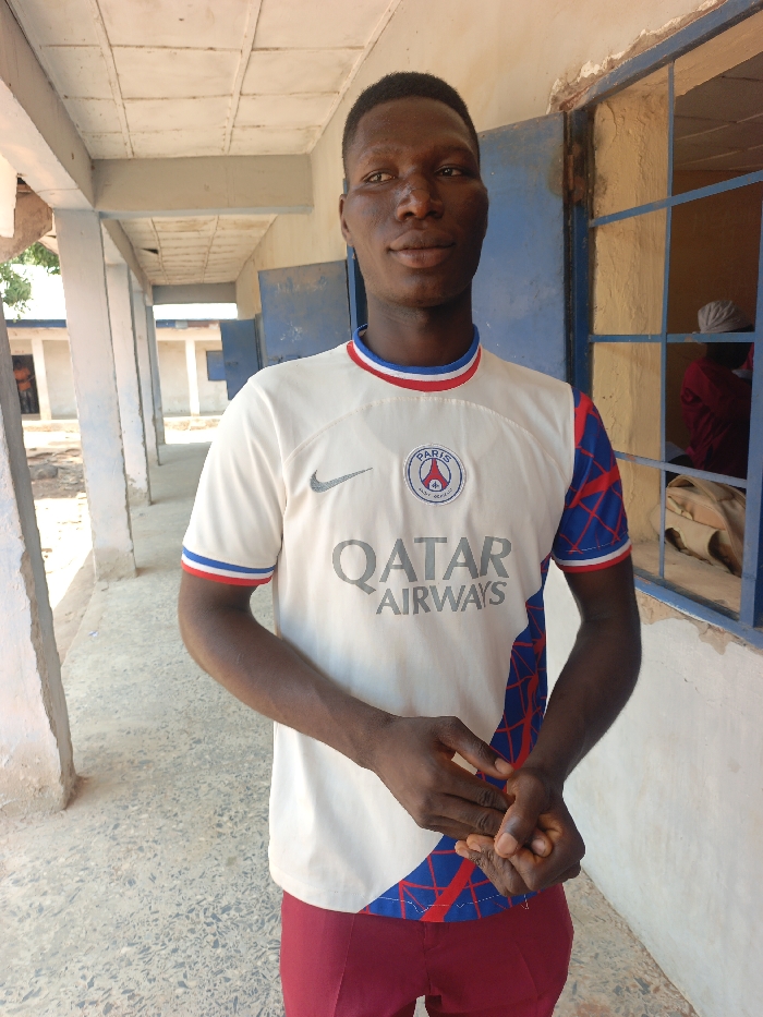 A male individual is standing under a covered concrete walkway in Mada, Nigeria