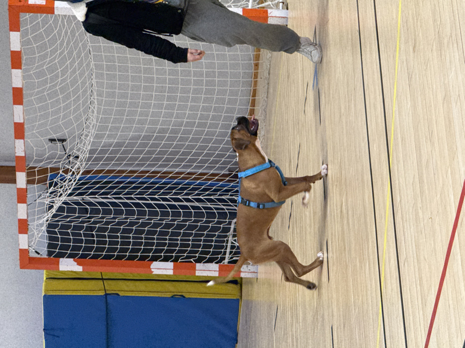 The image depicts an indoor sports hall in Sennecey-le-Grand, France. A medium-sized, short-haired brown dog, wearing a bright blue harness, is captured in motion on a light-colored wooden court. The dog has white markings on its paws and tail tip, with its tongue slightly extended. It is positioned in the mid-ground, facing right. To the right of the frame, a person is partially visible from the mid-torso down, wearing a black jacket with a white collar lining, grey sweatpants, and light-colored athletic shoes. In the background, a handball goal with red and white striped posts and a white net is prominent. To the far left, blue and yellow padded mats are stacked against a wall. The wooden floor features distinct black, red, yellow, and blue court markings. The dog appears to be interacting with the person, engaged in an activity within the gymnasium environment.