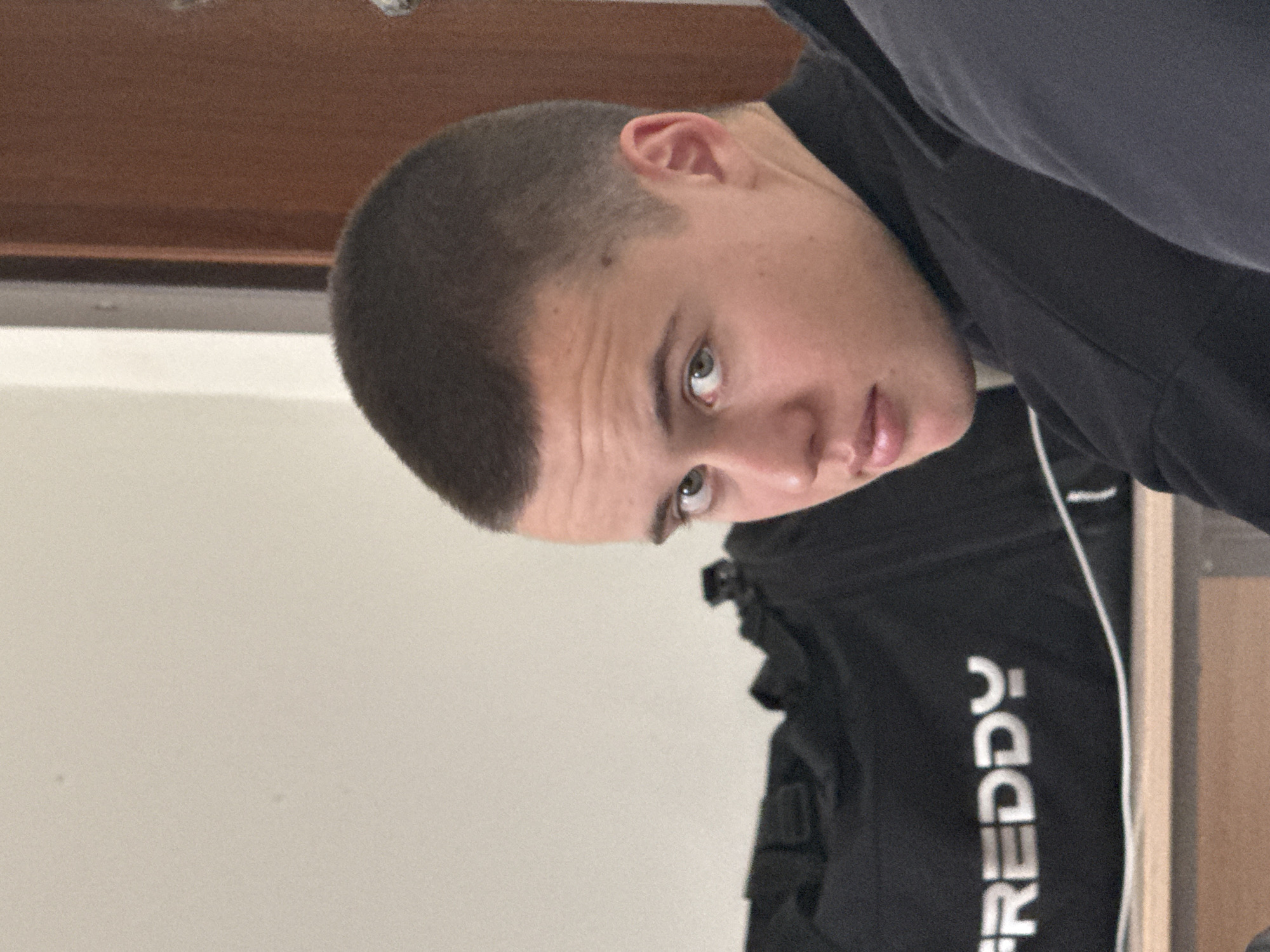 The image depicts an indoor scene in Sofia, Bulgaria. A male, appearing to be 16-25 years old, with a buzz cut and light-colored eyes, is positioned with his head turned slightly right, looking directly at the camera. He wears a dark, long-sleeved top. To his right, a second individual's dark grey clad shoulder and arm are partially visible. Behind the primary subject, a black duffel bag with "FREDDY" in white text rests on a light brown surface. The background consists of a plain light-colored wall to the left, and a brown wooden panel or door with a light vertical frame to the right.