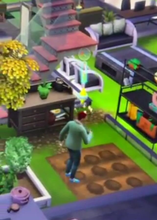 screen playing the Sims video game. The view is of an outdoor area with a Sim, possibly male, standing near a garden plot with planting holes. The Sim is wearing a green jacket and blue shoes. To the left, there are raised garden beds with plants. There's also a large tree with yellow foliage. A workstation with drawers is visible near the garden area. Further back, there is outdoor furniture, a staircase, and other house elements. The bottom of the screen displays the game's interface, including the Sim's name and other information.