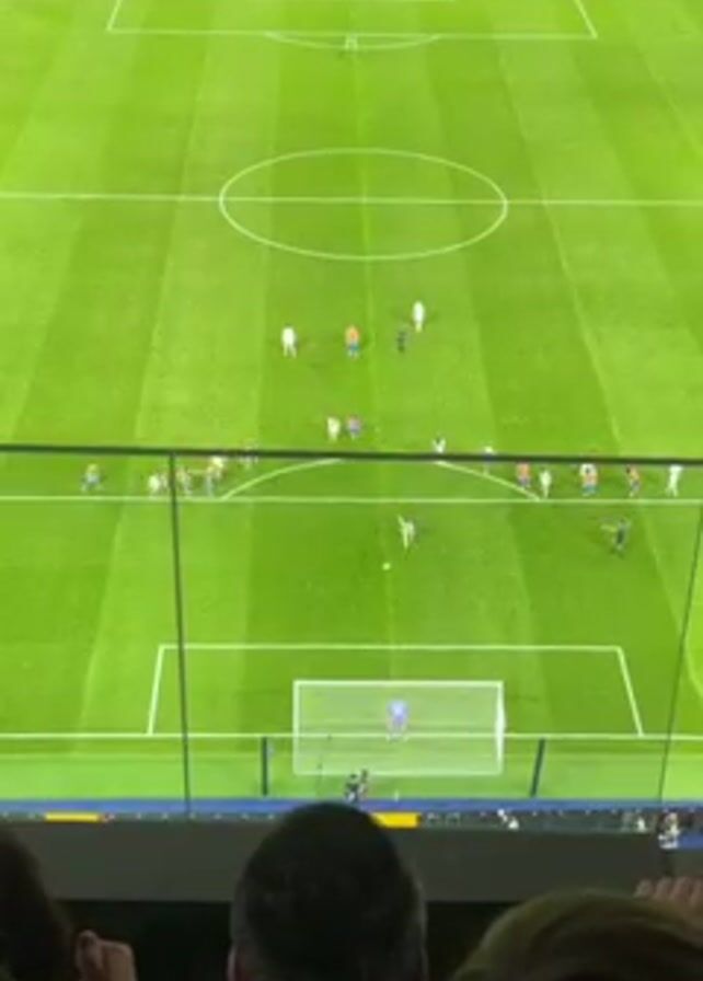 high-angle view of a soccer game taking place in a large stadium filled with spectators. The soccer field is green, with white lines marking the boundaries and key areas. Players are scattered across the field, engaged in the game. A section of the audience is visible at the bottom of the frame, cheering. There's a glass barrier separating them from the field. The score board indicates a score of 0-0. The video captures a moment of excitement, with the crowd reacting to the goal.