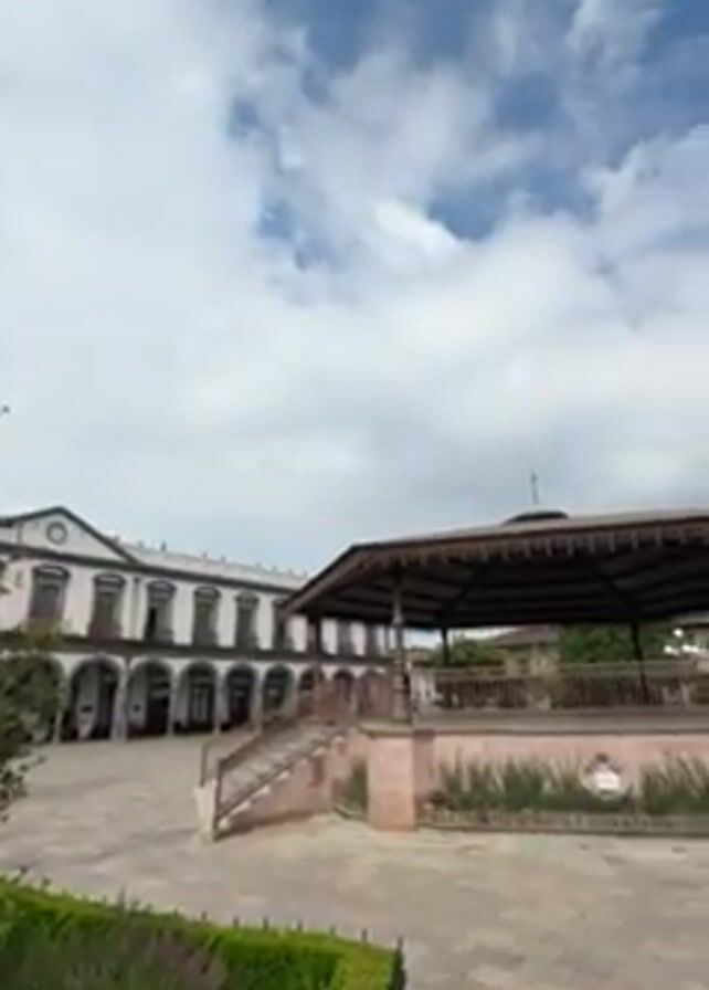 town square on a cloudy day. In the foreground, there’s a small, octagonal, elevated gazebo made of pink stone and dark wood. To the left of the gazebo is a tree and a low hedge. Behind the gazebo is a large white building with multiple arched windows and a clock on the roof. The ground is paved with stone blocks. The video pans right, showing more of the square, including lamp posts, lawns, and other buildings. The sky is partly cloudy with patches of blue.