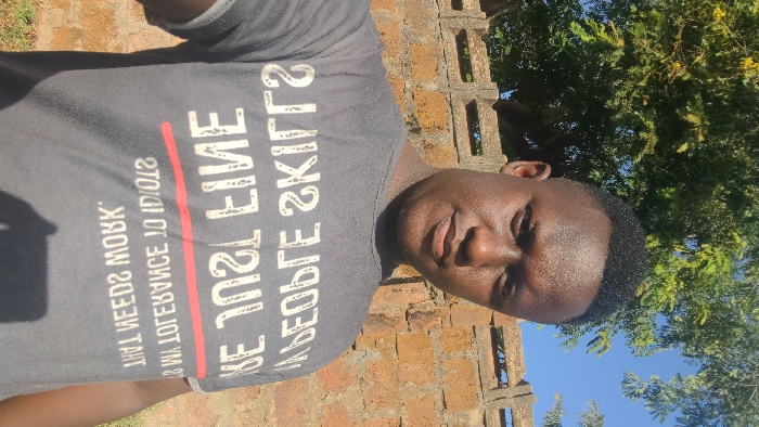 A man in a gray t-shirt with backward lettering poses outside. The text on the shirt includes phrases such as "TIME TO LIVE" and "THAT NEEDS WORK". He is standing in front of a brick wall with trees and blue sky visible behind it. The photo appears to have been taken outside on a sunny day, with the subject's face slightly sweaty.