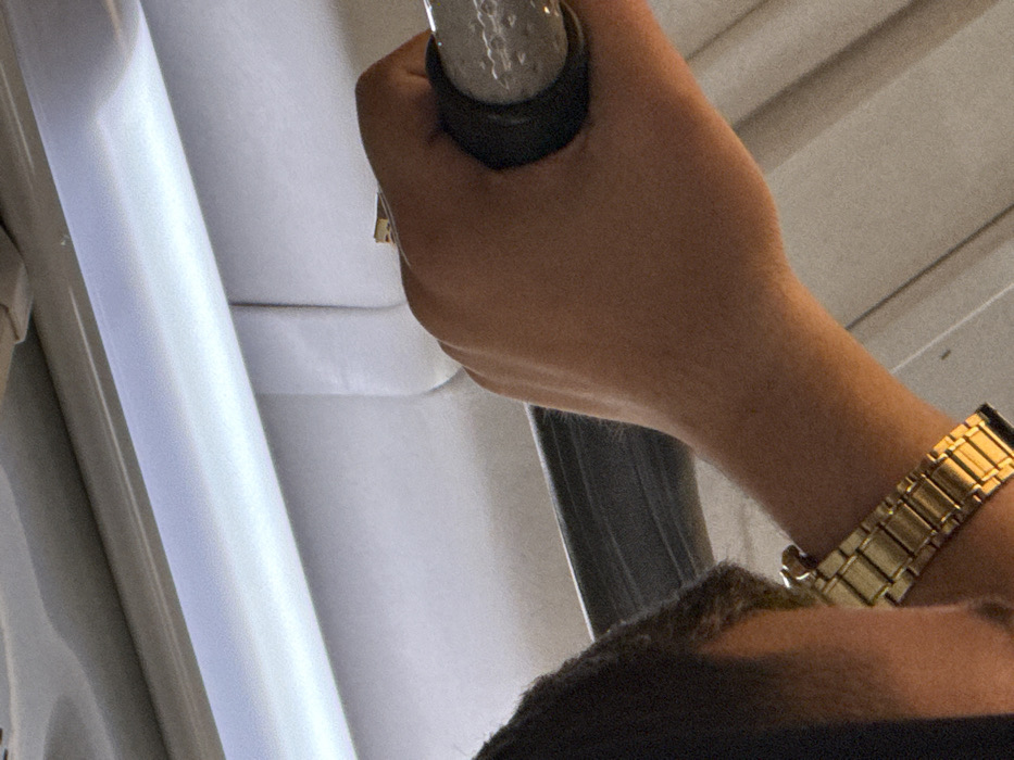 The image displays a close-up interior view of a public transportation vehicle, such as a bus or trolleybus, consistent with those found in Yerevan, Armenia. A person's right hand and forearm are centrally positioned, actively gripping a horizontal, silver-colored metal handrail. The handrail features a black rubberized or plastic grip where it is held. On the person's left wrist, a gold-colored metal watch with a link bracelet is visible. The left side of the person's head, showing dark hair, is partially visible on the far left. The background reveals light-colored (off-white or light gray) interior panels and seams of the vehicle, with a long, strip-like overhead light fixture emitting white illumination.