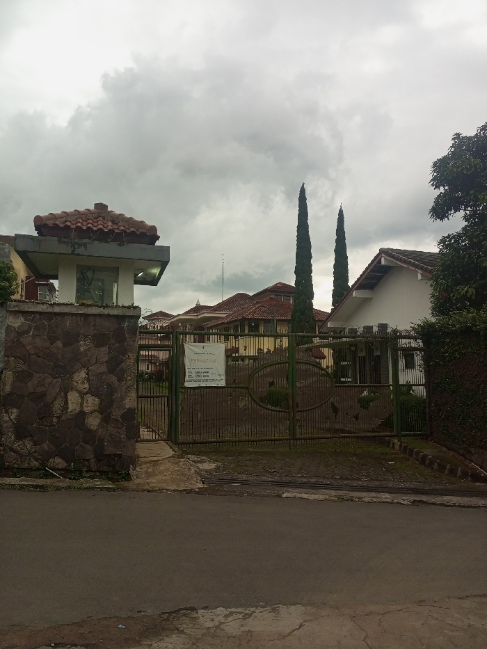 A gated entrance stands before a complex of buildings beneath an overcast sky. The gate is green, flanked by a stone pillar structure on the left. A sign hangs on the gate. Red-tiled roofs adorn the buildings within. Two tall, thin trees reach toward the sky. A green leafy vine climbs the wall to the right of the gate. A paved road stretches across the foreground.