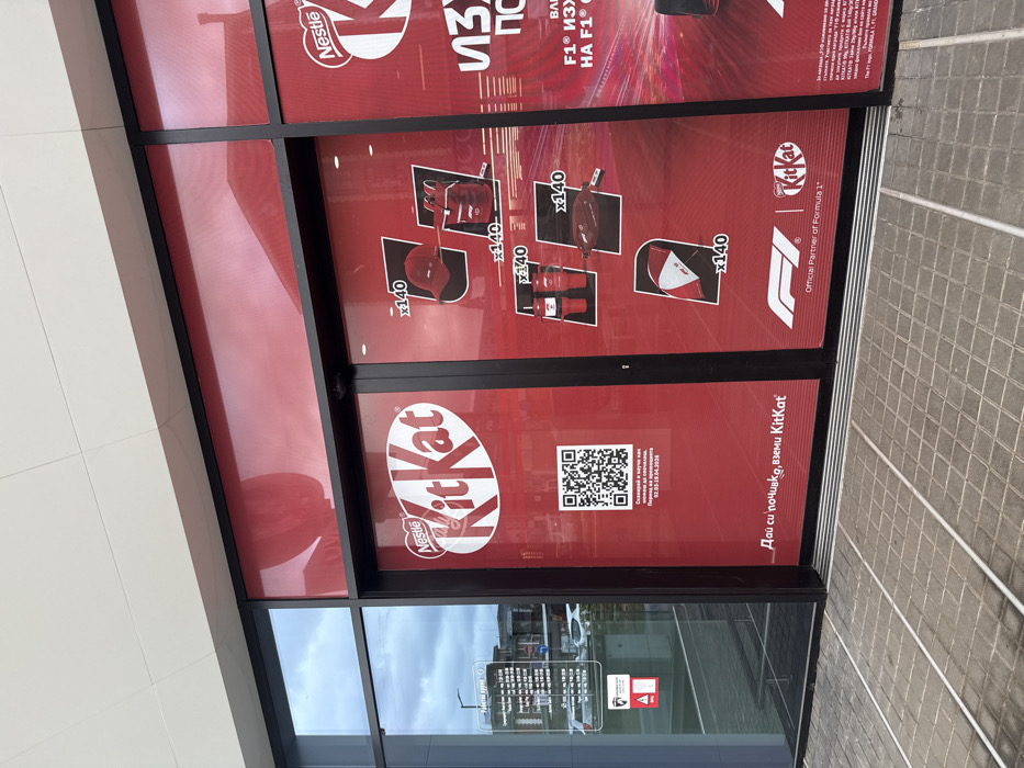 The image displays the exterior of a commercial building entrance, likely a retail store, within a city environment. The facade consists of large glass panels framed in black, with a plain white overhang above. Most of the glass area is covered by vibrant red advertising for "Kit Kat" by Nestlé. The central double doors and the adjacent right window panel are entirely covered in red promotional vinyl featuring the white "Nestlé Kit Kat" logo prominently. On the left door panel, below the Kit Kat logo, a black and white QR code is displayed with Cyrillic text below it, indicating a promotional period of "02.03-19.04.2020" and a call to action. Additional Cyrillic text at the bottom translates to "Give yourself a 'break', take KitKat." The right door panel and the adjacent window feature stylized images of red promotional items including a baseball cap, a backpack, two thermal cups, a fanny pack, and a kite, each marked "x140". The "Official Partner of Formula 1" logo and a smaller Kit Kat logo are also present on these panels. The leftmost glass panel is clear, revealing a cloudy sky, reflections of a street or parking lot with parked vehicles (including a white car), and distant buildings. Through this clear panel, a sign displaying "Работно време" (Working hours) in Cyrillic with a schedule, and a red triangular warning sign with an exclamation mark, are visible. The ground in front of the entrance is paved with light grey square and rectangular tiles. No individuals are present in the immediate foreground of the scene.