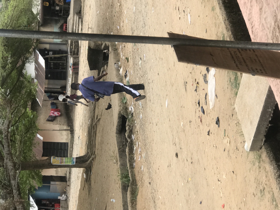 A man wearing a blue shirt and dark pants walks along a dirt path, a bag slung over his shoulder. He is flanked by what appear to be open drainage ditches. Behind him, buildings with tin roofs line the path, with clothes hanging on a line. A tree stands to the left. Debris is scattered across the ground, and a metal pipe runs horizontally across the upper portion of the image. A sign is visible on the right side.