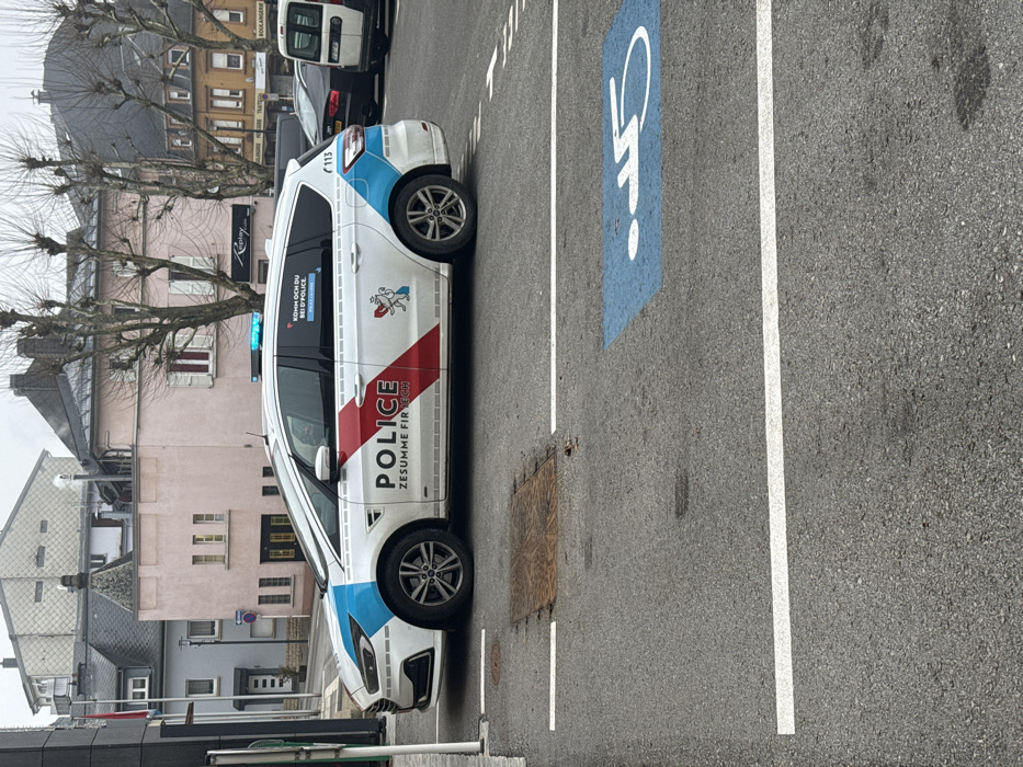 The image displays an outdoor street scene in Pétange, Luxembourg, under an overcast sky. A white Ford S-Max police vehicle is centrally positioned, oriented diagonally with its front-left quarter closest to the viewer. The vehicle features blue and red diagonal stripes on its sides, with "POLICE" printed in red capital letters and "ZESUMME FIR IECH" in white below it. The Luxembourgish coat of arms is visible on the rear side door, and the emergency number "113" is on the rear quarter panel. Blue emergency lights are illuminated on the vehicle's roof. Recruitment text "KOMM OCH DU BEI D'POLICE. POLICE.LU / 113" is present on the rear side window. The vehicle's lower body and wheels exhibit dirt accumulation. The asphalt pavement in the foreground features white painted lines marking parking spaces. A blue square containing a white international symbol of access (wheelchair user) is painted on the asphalt to the right. A rectangular metal manhole cover is embedded in the pavement between the police vehicle and the handicapped parking symbol. In the background, multiple multi-story buildings with various facades are visible, characteristic of European urban architecture. A building immediately behind the police vehicle has a light pink facade. To its left, a grey-facaded building is present. Further right, a building with an ochre facade partially displays "BOULANGERIE" on a sign. Bare-branched deciduous trees are scattered throughout the background. Other parked vehicles, including a dark-colored sedan and a white van, are visible further down the street. No individuals are present in the depicted scene.