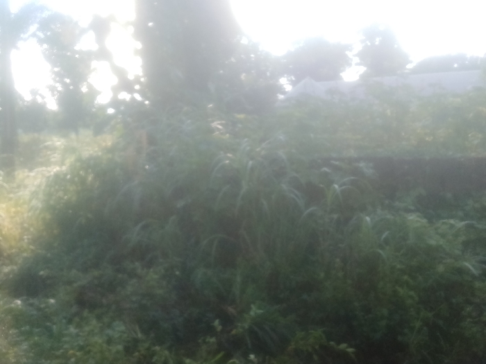 The image displays a significantly blurred and overexposed outdoor scene, likely an undeveloped plot or overgrown area within the city of Unknown, Unknown