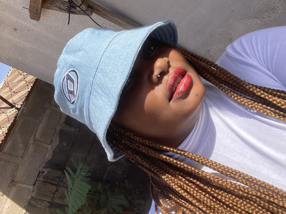 An individual, identified as an adult female, is depicted in a close-up, outdoor shot in Rido, Nigeria. She is wearing a light blue denim bucket hat with a white and black embroidered logo on the front, partially obscuring her eyes. Her hair is styled in light brown box braids. She has red lipstick applied and a silver stud nose piercing on her left nostril. She wears a white long-sleeved turtleneck top. Strong direct sunlight from the upper right illuminates her face and upper body, casting shadows from the hat over her forehead and eyes. The background consists of a weathered concrete block wall. To the left, a small green plant is visible. Above the concrete wall, corrugated metal roofing topped with barbed wire fencing is present. A weathered wooden plank or beam stands vertically on the right side of the frame. The subject looks directly at the camera.