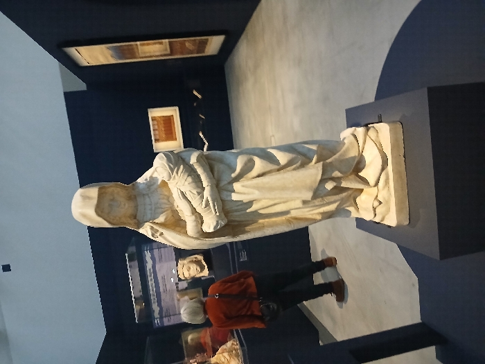 The image displays an interior gallery scene within the Louvre-Lens museum in Lens, France. A large, light-colored stone sculpture of a draped female figure, likely the Virgin Mary, holding a swaddled infant, likely Jesus, stands centrally on a dark, rectangular pedestal. The sculpture is approximately life-size, exhibiting carved drapery and a hooded head. The gallery features dark blue-grey walls, a light grey floor, and a white ceiling. Artificial lighting illuminates the exhibits, casting a distinct shadow from the main sculpture onto the floor. In the mid-ground, to the left of the sculpture, a single individual is present, seen from behind. This person has short grey hair, wears a reddish-brown long-sleeved top, dark trousers, and brown shoes, and carries a black shoulder bag. They are facing towards the left, observing other exhibits. Visible in the background to the left are glass display cases containing artifacts, including a classical-style head sculpture and a reddish-brown object, along with an informational text panel. To the right of the central sculpture, a tall, vertical framed artwork with a light background and dark figures hangs on the dark wall.