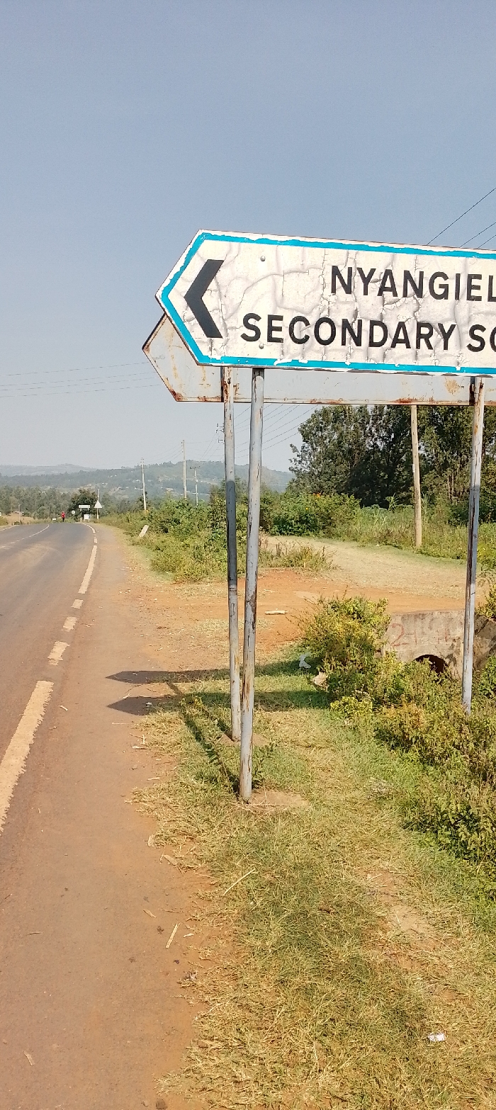 The image displays a roadside view in South Kasipul ward, Kenya, under a clear, light blue sky, indicating midday or early afternoon based on the short shadows. A white, hexagonal road sign with a faded blue border and a black left-pointing chevron is prominently positioned on the right side of the frame. The sign displays the text "NYANGIEL" on its upper line and "SECONDARY SC" (likely "SECONDARY SCHOOL") on the lower line. The sign's surface shows significant cracking and peeling paint, and its supporting metal poles are rusted and discolored. To the left of the sign, an asphalt or paved road, light brown-grey in color, features a dashed white line along its right edge. The road recedes into the distance, curving to the left. The immediate roadside on the right consists of a dirt shoulder transitioning into sparse, dry grass and patches of green and yellowed bushes. A concrete drainage culvert, bearing the numbers "2-1-", is partially visible beneath vegetation near the base of the sign on the right. In the far distance along the road, a small, indistinct figure, possibly a person, is visible near another roadside sign. Rolling, green-brown hills form the distant horizon, and multiple utility poles with overhead lines are discernible along the road and in the background. No discernible actions or interactions are occurring in the immediate foreground.