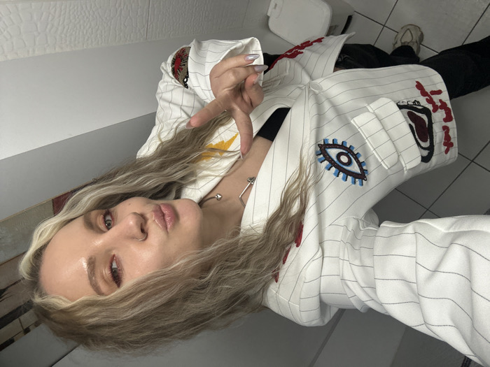 The scene depicts a female individual taking a selfie indoors, located in the city of Kadıköy, Turkey. The subject, a woman with long, wavy blonde and dark blonde hair, is centered in the frame, facing the camera with her head slightly tilted to the right and lips partially puckered. She displays a small silver nose ring on her left nostril and wears a silver-colored necklace with a small heart-shaped pendant. Her attire includes a white blazer with thin black pinstripes, extensively adorned with various appliqués: a prominent blue and white eye design, a red and black abstract shape, red drip-like embroidery, and a yellow lightning bolt. A black garment is visible beneath the blazer. Her right arm is extended towards the camera, with her hand making a "V" (peace) gesture. Partially visible on her lower left, she wears black pants and a white sneaker featuring a heart design. The background is an interior space characterized by white tiled walls and a white tiled floor. A white rectangular fixture is visible on the lower right floor. A small section of a patterned textile or artwork is discernible on the upper right wall. The lighting is bright and appears artificial. The image is presented with a slight counter-clockwise rotation.