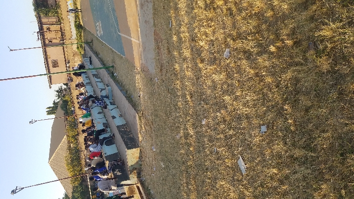 An outdoor scene is depicted in what appears to be a recreational area within the city of Jos, Nigeria, under clear daylight conditions with low-angle sunlight. The foreground consists of an expanse of dry, yellow-brown grass littered with scattered white plastic debris and other small, light-colored objects. In the midground, a set of weathered concrete bleachers with multiple tiers, painted in faded blue and black/grey, occupies the left-center. Approximately 20-30 individuals, mostly male and casually dressed, are seated or standing on these bleachers, facing generally towards the right. A section of a sports court, likely basketball or handball, with light blue and orange/tan painted surfaces and white lines, is visible to the right of the bleachers. Three tall, slender poles fitted with light fixtures are positioned between the bleachers and the sports court. One individual stands alone on the far right edge of the visible sports court. The background features a low concrete wall behind the bleachers, beyond which several buildings are visible. One prominent building has a dark brown hip roof, and another, to the right, is a light brown, single-story structure. Sparse trees and shrubs are present between the buildings. The sky above is clear and light blue.