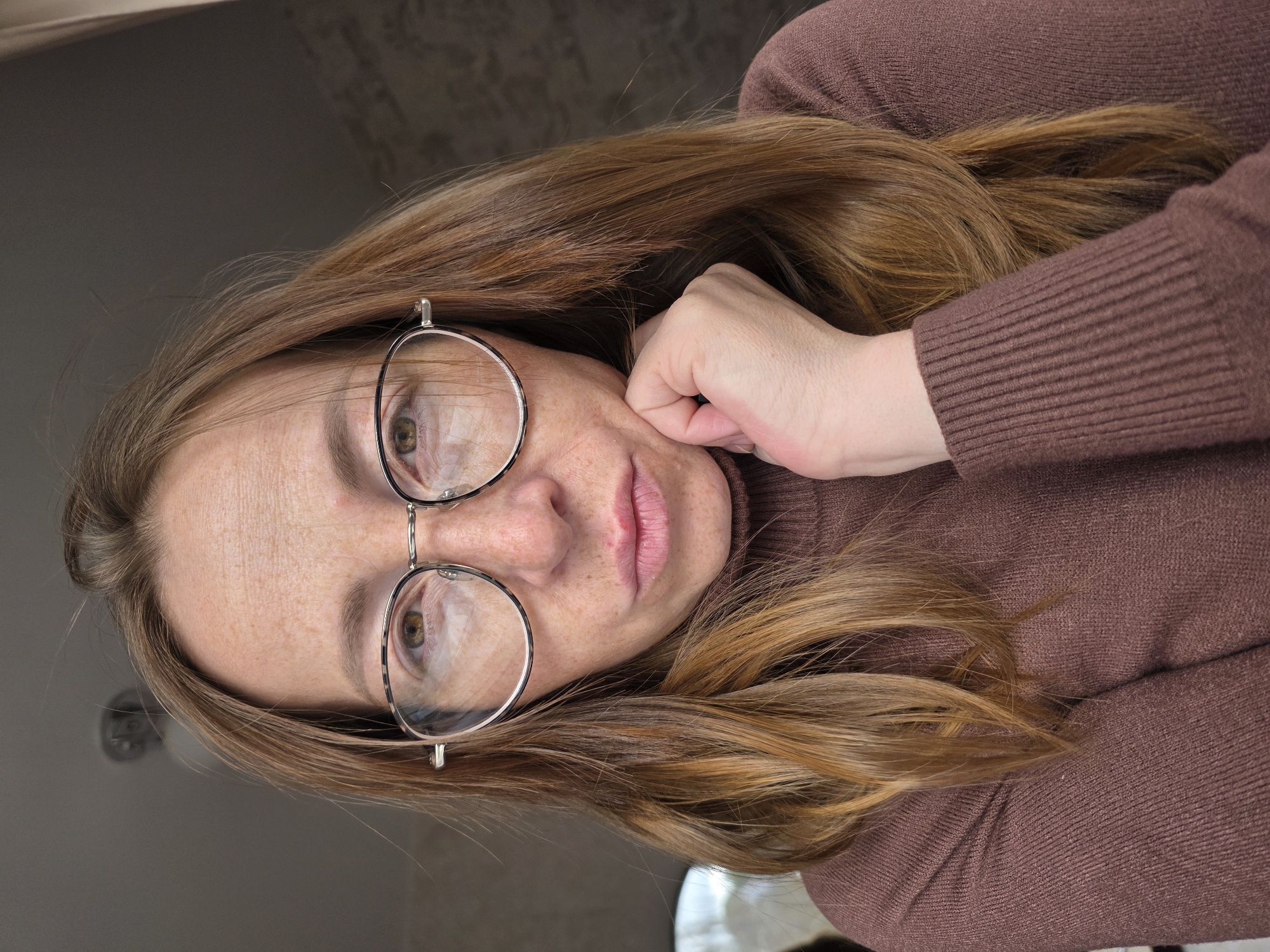 A fair-skinned woman with light brown or red hair, and freckles on her face is wearing glasses and a brown turtleneck sweater
