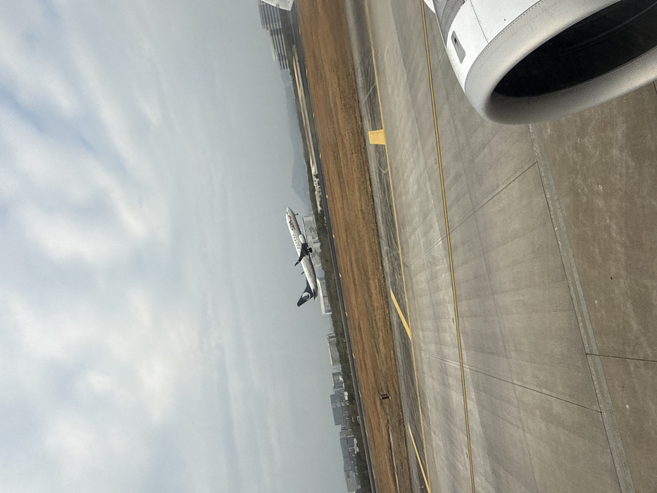 An airplane is taking off from an airport runway, viewed from the window of another aircraft. The runway stretches into the distance, with buildings visible alongside. The engine of the viewer's plane is partially visible in the upper right corner. The sky is overcast. The taking off aircraft is white with blue accents. The runway has yellow painted lines.