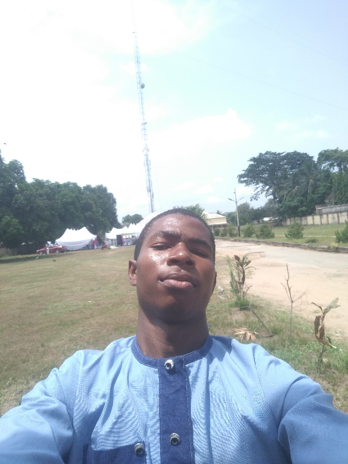 A young, dark-skinned male, wearing a light blue long-sleeved tunic with a dark blue placket and decorative silver-colored buttons, is depicted in a selfie taken outdoors in Aba, Nigeria