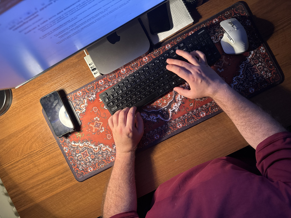 - "A person types on a black keyboard atop a red patterned desk mat" by FM-osXZC2, licensed under CC BY 4.0