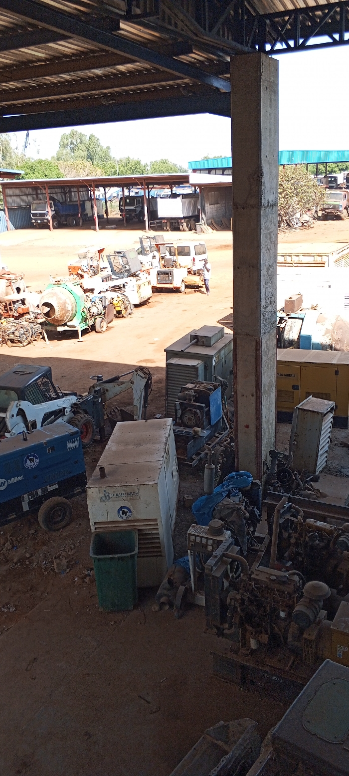 The scene depicts an industrial equipment yard in Hayin Banki, Nigeria, captured from an elevated position under a metal-frame roof structure with corrugated panels
