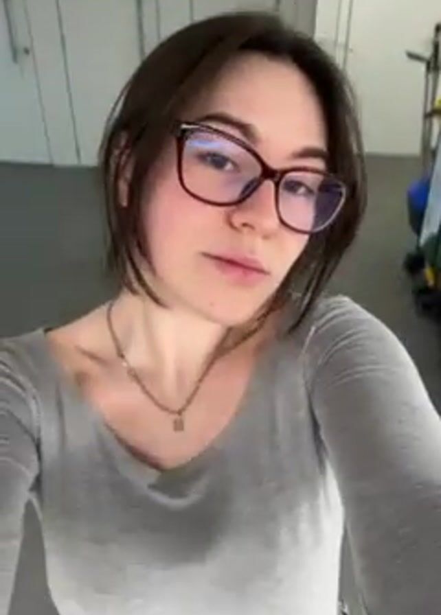 A young woman with shoulder-length brown hair is looking directly at the camera. She is wearing rectangular glasses with a dark red frame, a light gray long-sleeved shirt, and a silver necklace with a pendant. She has a neutral expression on her face. The background is blurred, but appears to be an indoor space with light-colored walls. The camera is positioned slightly above the woman's eye level and is moving slightly. There is faint audio in the background.