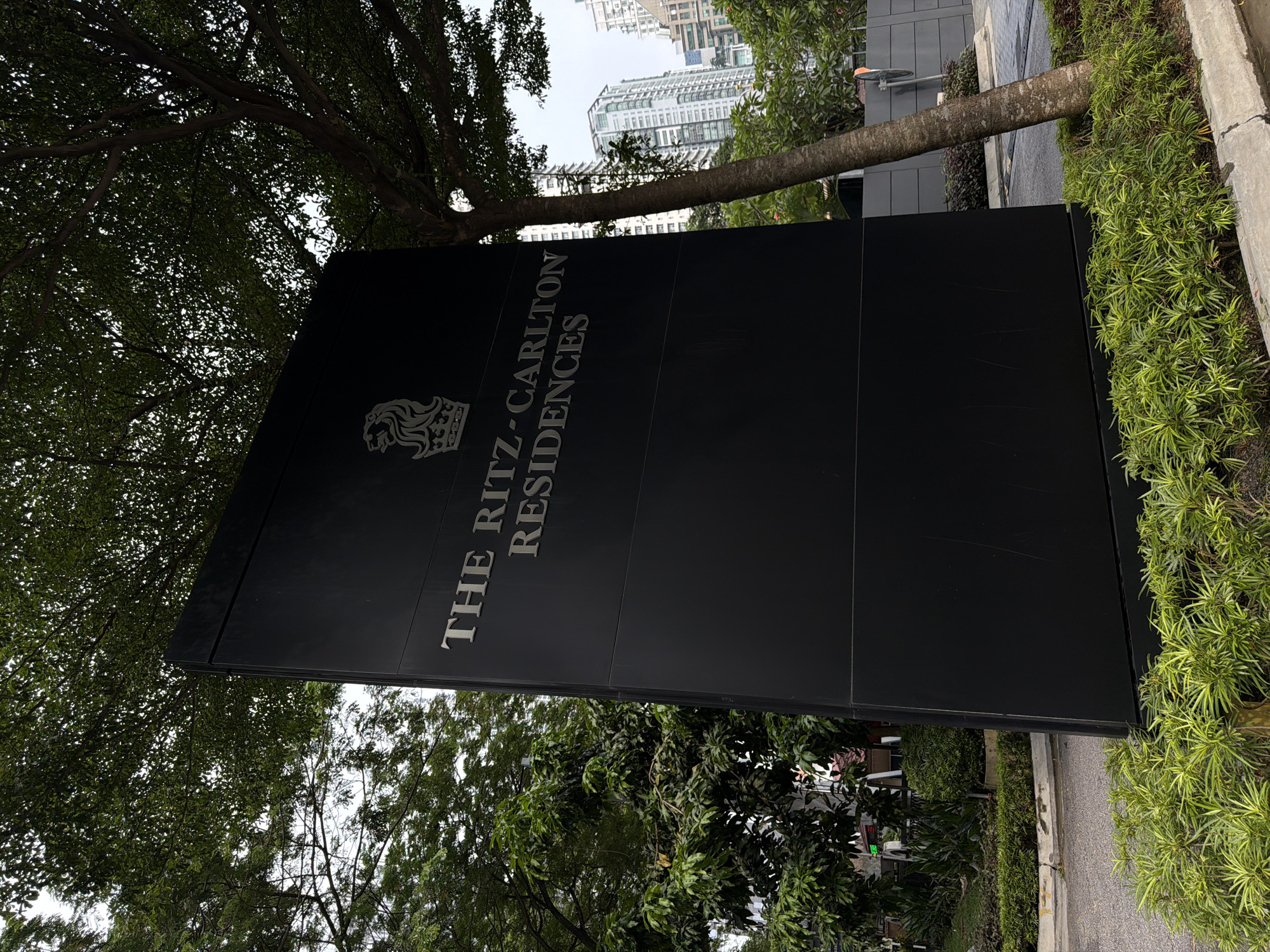The image displays a prominent, dark grey or black, angled monolithic sign for "THE RITZ-CARLTON RESIDENCES