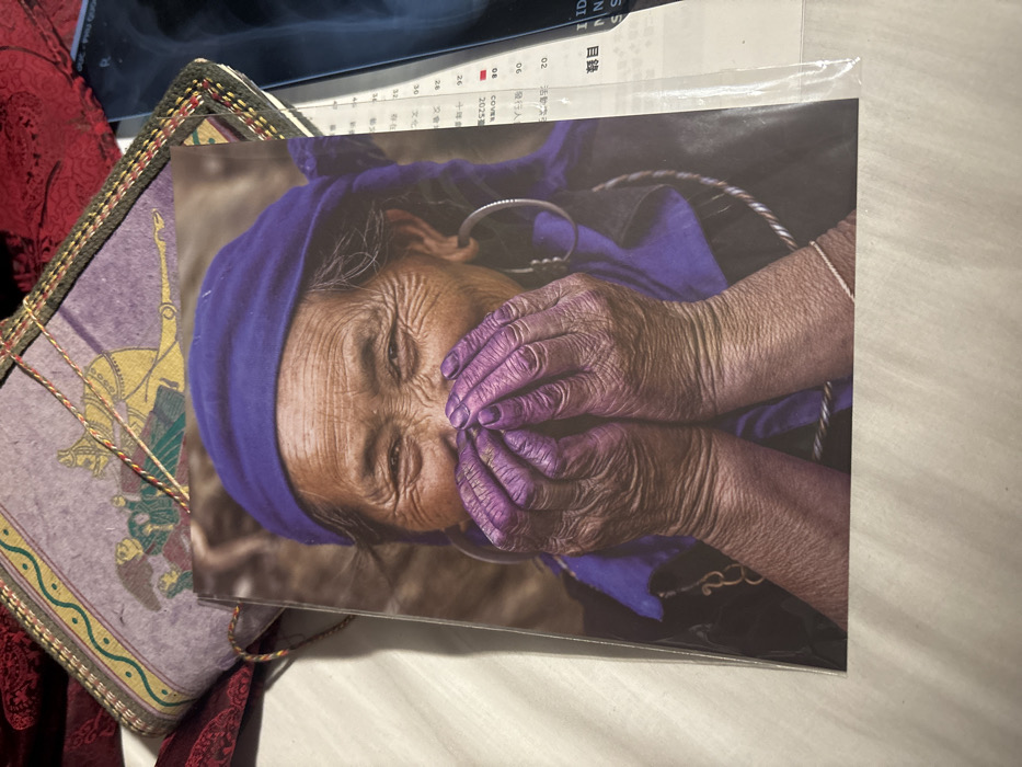 The image displays a close-up overhead view of a photographic print, protected by a translucent plastic sleeve, resting on a light-colored surface within Hội An Ward, Vietnam. The central subject of the print is an elderly individual, likely a woman, with prominent facial wrinkles around her eyes, which are smiling. She wears a deep blue or purple head covering and a dark garment. Her hands, covered in a vibrant purple pigment, are positioned over her mouth and nose. Large silver hoop earrings are visible on both ears. Beneath and partially to the left of the print is a light purple fabric item, possibly a pouch or book cover, featuring intricate yellow and red patterns depicting figures and geometric designs. To the right of the print, a document is partially visible, showing columns of text, numbers (including "90" and "20"), and what appears to be a medical image resembling an X-ray on its far right edge. The background consists of a uniformly light-colored, possibly fabric, surface.