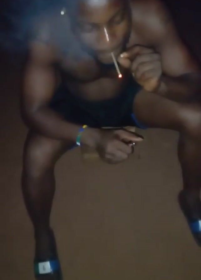 A medium shot shows a shirtless man seated on an unseen object. He has dark skin, is wearing black shorts with a blue stripe, and slides on his feet. He has dark hair pulled back into a small ponytail with beads. He is holding and smoking a small cigarette or joint, using a lighter in his other hand. The area around him is brown and dark, giving the impression of an outdoor or dimly lit space.
