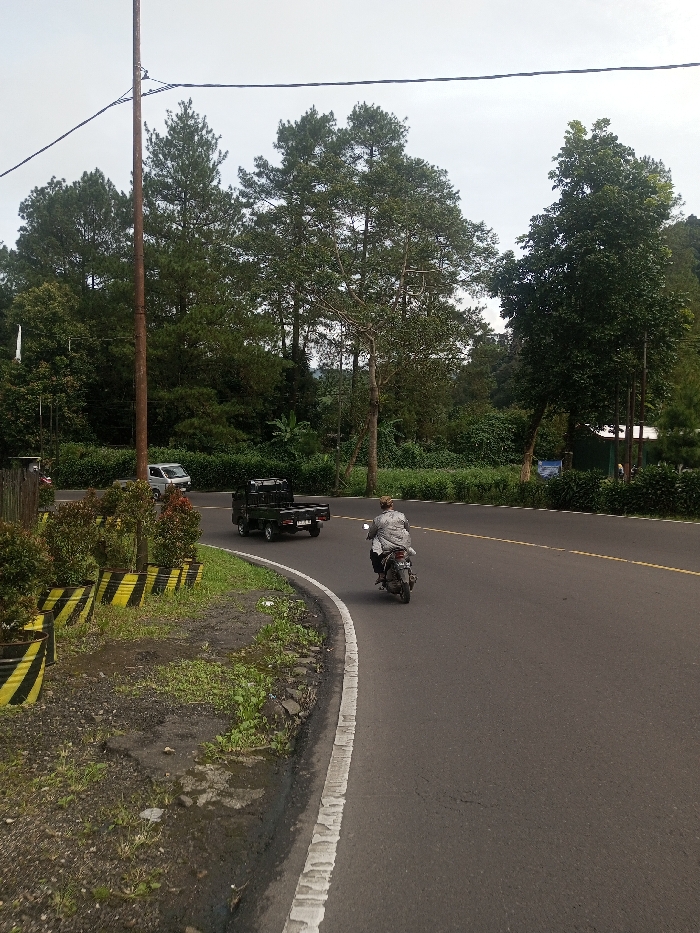 The image depicts a curved asphalt road in Thanthirimale, Sri Lanka, under an overcast sky. A person on a dark motorcycle, wearing a light-colored jacket, travels away from the viewer around a right bend. A dark-colored pickup truck precedes the motorcycle on the same curve, while a light-colored minivan is visible in the distance on the opposing side of the road. The road features a solid white line along its left edge and a double yellow center line further right. The immediate left foreground consists of a dirt verge, a concrete curb, and several black-and-yellow striped plant pots containing small shrubs. A wooden utility pole with overhead wires rises on the far left. The background is dominated by dense green vegetation, including numerous tall trees, with a partially visible green-roofed structure situated among the trees on the far right.