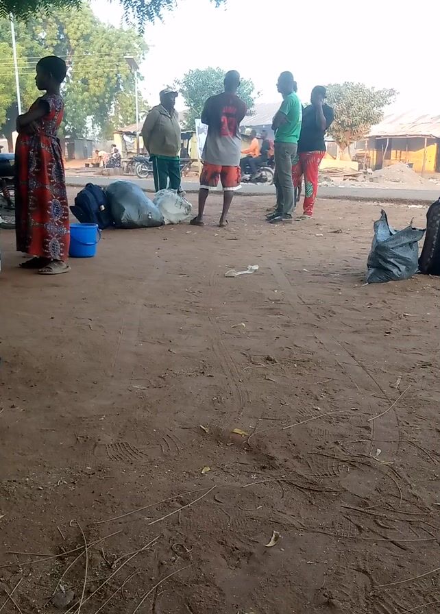 The scene shows a group of people standing on a dirt road in a rural area. There are at least six people visible, including a woman in a red and black patterned dress standing in the foreground and five men standing in a line further down the road. The men are wearing various casual clothing. Several bags and a blue bucket are placed near the men on the ground. In the background, there are buildings, trees, and a motorcycle. The road is made of dirt and has some scattered leaves and debris. The overall lighting suggests it is daytime, and there is a tree on the left side of the frame, partially obscuring the view.