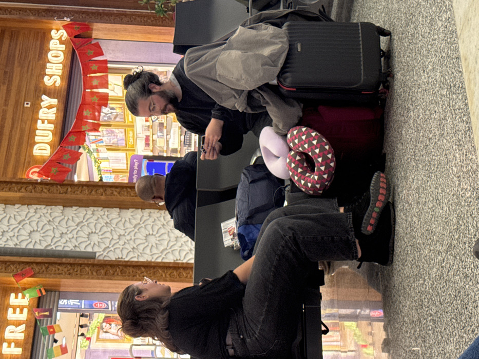 At an airport, a man with a beard and hair in a bun uses a phone. Behind him, another man is seated. Luggage and travel pillows are nearby. A woman in black sits to the side. "DUFRY SHOPS" and "FREE" signs are visible with flags. The backdrop features intricate wall designs and retail displays.