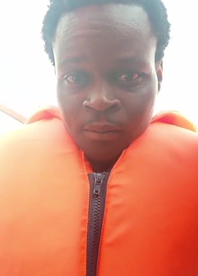 A man with short curly hair wears an orange life vest. He has a serious expression and looks into the camera. He appears to be outside in bright light, perhaps on a boat. Laughter can be heard.