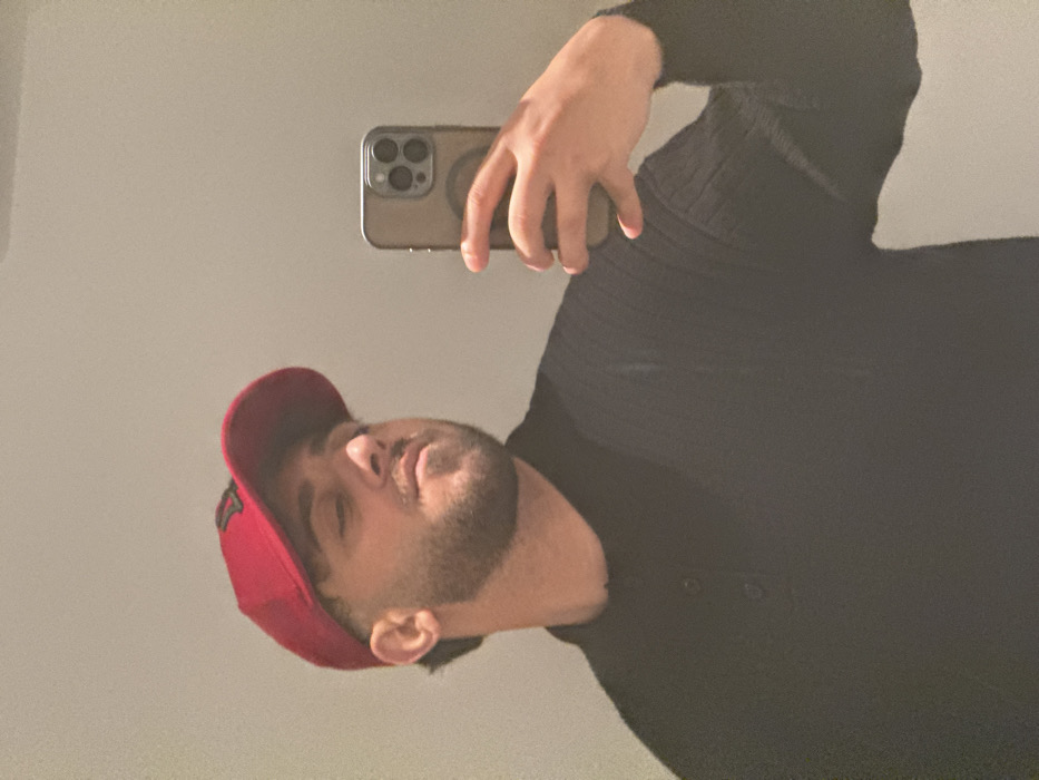 A person wearing a red baseball cap and a dark long-sleeved shirt is taking a selfie. The phone, held in the person's right hand, is positioned in front of their face. The person has a beard and appears to be indoors, with a light wall visible behind them. The image is rotated counter-clockwise.