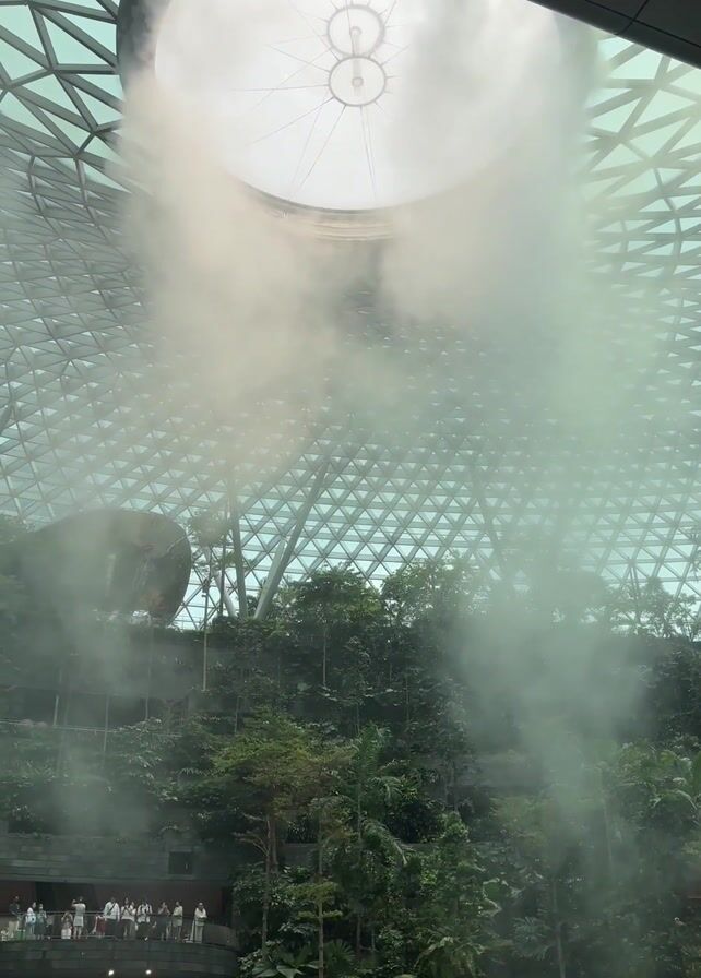 inside of the Jewel Changi Airport in Singapore. A large manmade waterfall, a central focal point, cascades from a large oculus in the center of the building’s glass and steel domed roof. Mist is created at the base of the waterfall. Lush greenery covers the building’s interior. People are visible on different levels, looking at the waterfall. Shops can be seen on the lower levels.