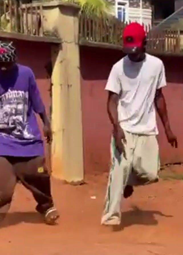 Two men are dancing in a dusty area outside. One man is wearing a purple t-shirt with a graphic on it, brown pants, and a bandana. The other man is wearing a white t-shirt, white pants with a green stripe, and a red baseball cap. There is a red wall with a stone fence behind them. There is a house in the background. A palm tree is visible above the fence line. The man in purple pants moves forward. The man in white follows.