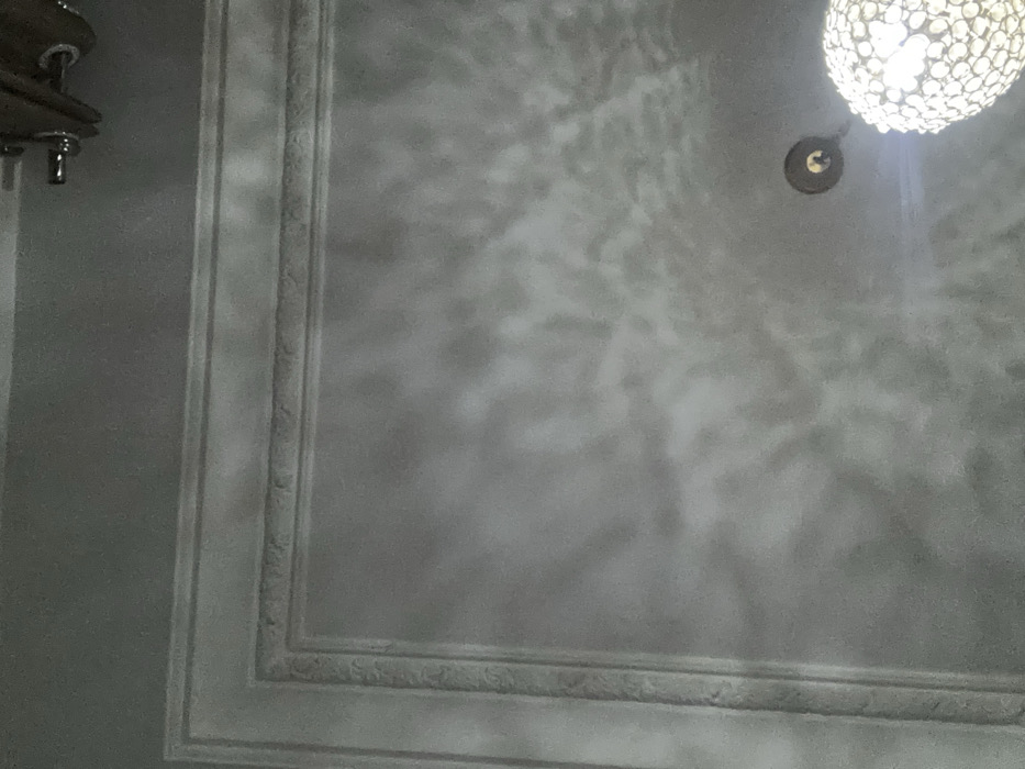A gray-toned architectural detail showcases a square panel framed by ornate molding. The panel's surface features a clouded pattern. In the upper right, a bright, spherical chandelier casts light. A portion of another fixture is visible in the upper left corner, offering a glimpse of its wooden and metallic components.