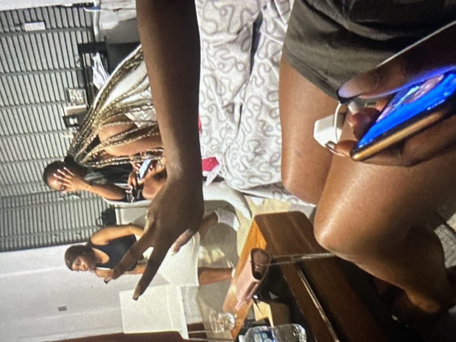 Three women are in an indoor setting. One has long blonde braids, her face partially obscured by her hand. A woman in a black tank top sits beside her. The third woman, positioned on the right, is holding a cell phone. A hand in the foreground is positioned in a peace sign. A bed with a patterned blanket, furniture, and a water bottle are visible. The photo appears to be taken from a low angle.