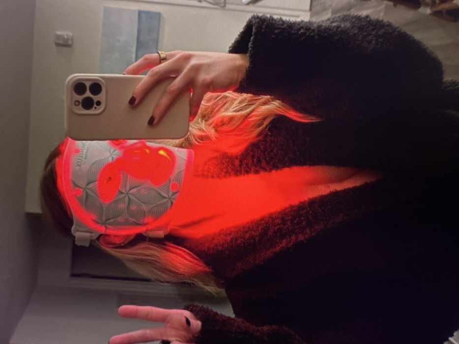 A person with blonde hair takes a selfie in a mirror wearing a red light therapy mask