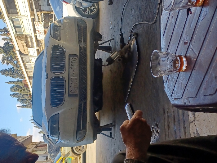 The image depicts an outdoor urban scene in the city of As-Sabina, Syria. A white BMW sedan (F10 generation) is centrally positioned, elevated on two yellow jack stands, indicating repair work. Its front bumper is removed, exposing the underside, and a Syrian license plate, bearing '302325 | الرقه | ٢٣٢٥٠', is affixed. Beneath the vehicle, a disconnected automotive component, consistent with a steering rack assembly, lies on the ground, connected by hoses and electrical wires. In the bottom left foreground, the partial profile of a male individual is visible, holding a silver object. Two small clear glass cups, one containing an amber liquid, rest on a dark brown plastic stool in front of him. The background features multi-story buildings with awnings and Arabic signage, including 'صيدلية الامين...' and 'للسيارات', alongside other parked vehicles, one being a yellow sedan. Tall evergreen trees are visible above the buildings under a clear sky.