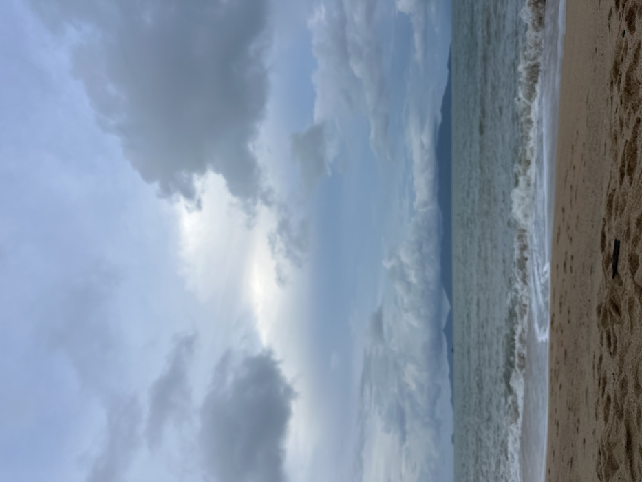 This image displays a coastal landscape captured at Baan Bo Phut, Thailand. The scene is dominated by an overcast sky, filled with dense, gray and bluish-gray clouds, with a notable brighter, diffused area in the upper center indicating obscured light. Below the sky, the midground presents a body of dark teal-colored ocean water with moderate wave activity, characterized by white foam where waves break and recede towards the shore. A low-lying, dark landmass, consistent with a distant island or mountain range, is visible along the horizon, partially veiled by atmospheric haze or low-hanging clouds. The foreground consists of a light brown sandy beach, exhibiting subtle textures and indentations. A small, dark, elongated object lies horizontally on the sand in the lower right quadrant. No human figures, animals, or significant man-made structures are present within the frame.