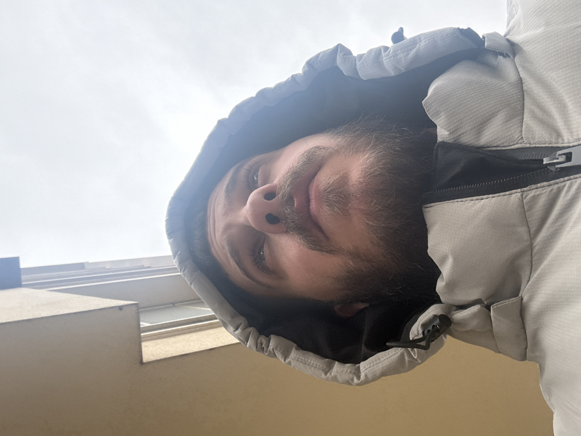 A man is wearing a hooded jacket, positioned so that the camera is looking up at him. The man has fair skin, blue eyes, and a beard. The hood of the jacket is light grey. The sky is overcast. In the background, there is a building with windows. The location is impossible to determine definitively as Sofia, Bulgaria from the image. Further analysis would be needed.