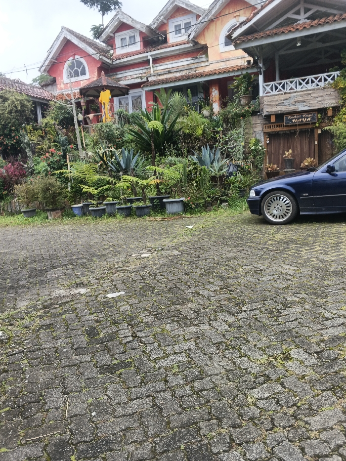 The image presents an exterior scene located in Bagochen Boolingpang Ueling, Bhutan, under an overcast sky. The foreground features a worn paved area composed of interlocking grey concrete pavers, with visible moss and weeds growing in the crevices. Several small pieces of white debris are scattered across this surface. On the right side of the paved area, the front half of a dark blue two-door vehicle, equipped with silver multi-spoke alloy wheels, is parked, facing left. The midground and background consist of a steep, densely vegetated incline leading up to a multi-story building complex. The vegetation includes numerous potted plants in grey and black containers, large fern varieties, spiky agave-like succulents, and various shrubs, some bearing red or pink flowers. The building complex displays architectural features such as red and faded orange facades, white window trim, and pitched roofs with light-colored tiles and multiple dormer windows. A large arched window is visible on the red section of the structure. On the far right, an open-air porch with a white cross-patterned railing is present. Below this porch, a wooden sign is mounted, bearing the inscription "Kedai Kopi NAYU". A single yellow garment hangs from a railing or line on the red building facade, beneath a small brown-roofed canopy.