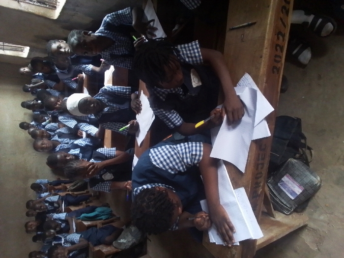 The scene depicts a classroom in Tabu, Nigeria, filled with approximately 20-30 young students, primarily female, uniformly dressed in blue and white plaid shirts with dark blue or black vests/pinafores
