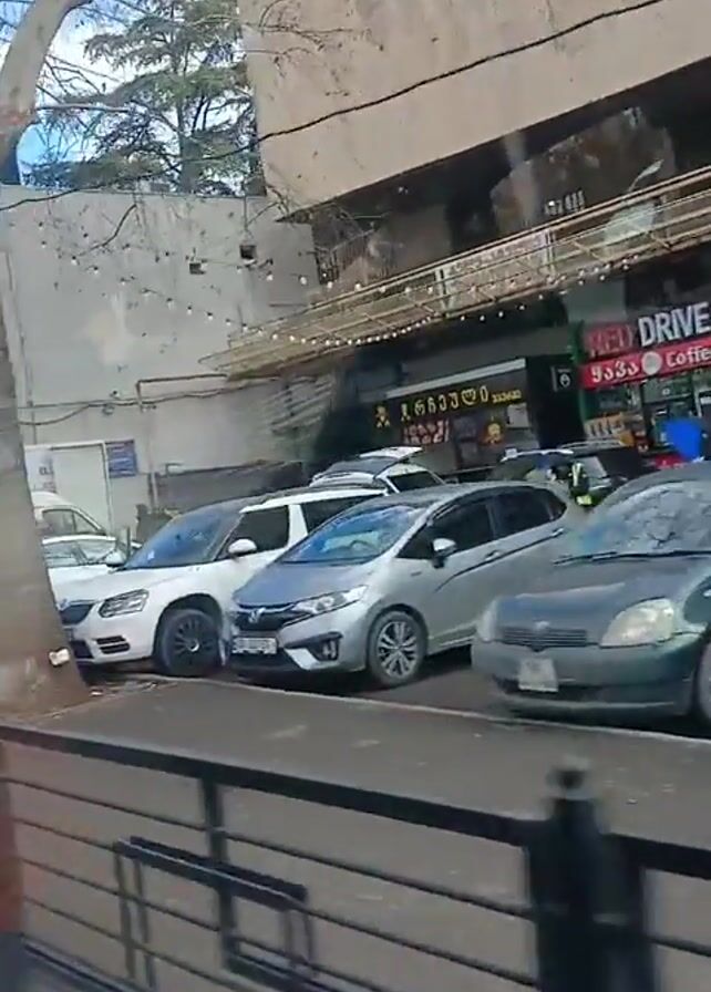 The camera moves slowly alongside a sidewalk. On the sidewalk, a produce vendor’s wares are displayed on crates and pallets, including oranges and juice boxes. Several people are walking on the sidewalk, including one woman wearing a dark jacket and blue jeans, carrying a white bag in her left hand and a brown bag with a red handle in her right hand. Parked cars line the street. A traffic light turns green. Businesses can be seen behind the parked cars. The sky is visible and appears overcast. A black metal railing runs along the edge of the sidewalk.