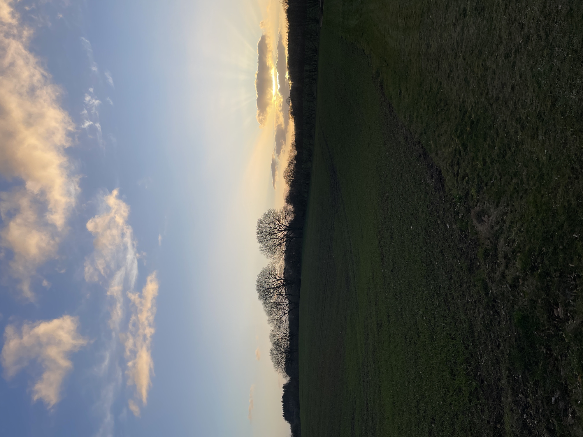 The image depicts a rural scene at dusk or dawn. The sky is partially cloudy, with sunlight streaming through a gap in the clouds, creating a radiant effect. The left side of the image features a blue sky with light, fluffy clouds. A row of trees without leaves runs horizontally across the middle of the image, separating the sky from a green field. The field occupies the right side of the image and appears to be freshly plowed, with faint track marks visible. The photograph is taken at an angle, possibly tilted slightly counter-clockwise. The location is likely in the vicinity of Vejle, Denmark, given the landscape. There are no visible people, interactions, or explicit actions occurring in the scene. The environment is calm and natural, with a focus on the landscape and sky.