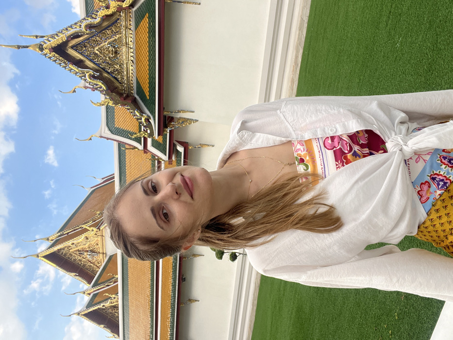 An outdoor, eye-level full-shot captures a female subject positioned centrally in front of traditional Thai temple architecture in Bangkok, Thailand