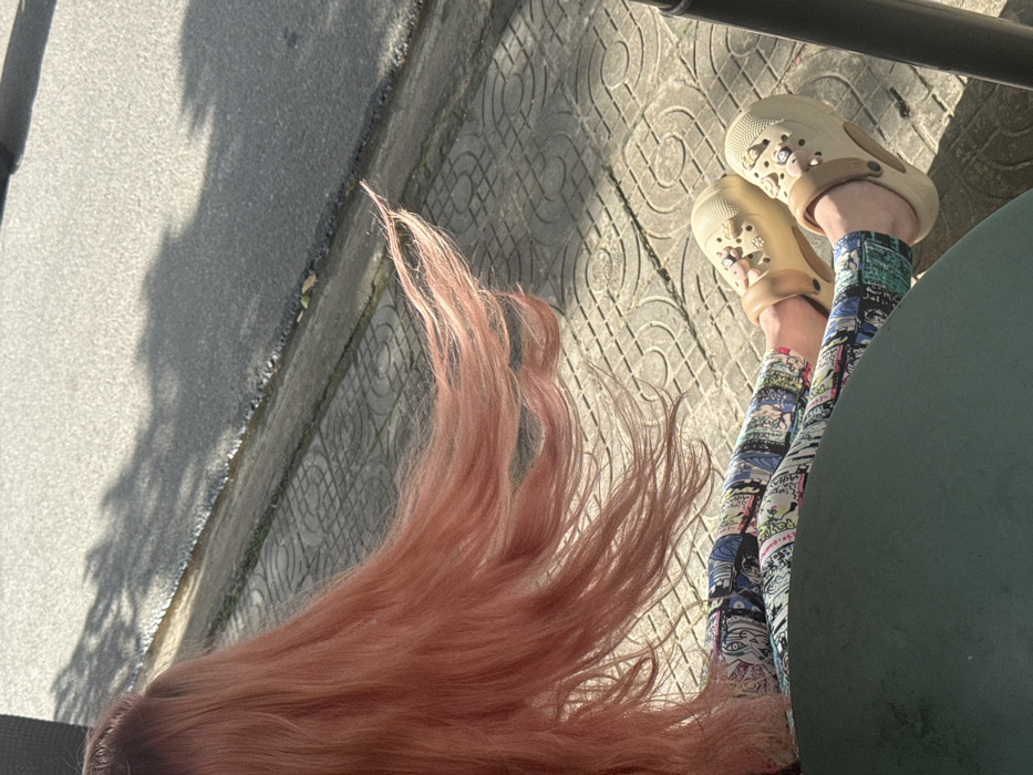A partial view of an individual is depicted in an outdoor setting in Ngũ Hành Sơn Ward, Vietnam. The subject, seen from behind and above, has long, pink-dyed hair, which appears swept to the right. They are wearing multi-colored, graphically patterned leggings and light beige-colored clogs adorned with small, light-toned decorative charms on the top. A dark green, curved surface, likely a chair or table, is in the lower left foreground. The individual's feet rest on a light-colored tiled sidewalk featuring a repetitive geometric pattern. Adjacent to the sidewalk, a dark asphalt road is visible. The scene is illuminated by strong sunlight, casting distinct shadows, including those from overhead foliage, across the asphalt and parts of the sidewalk.